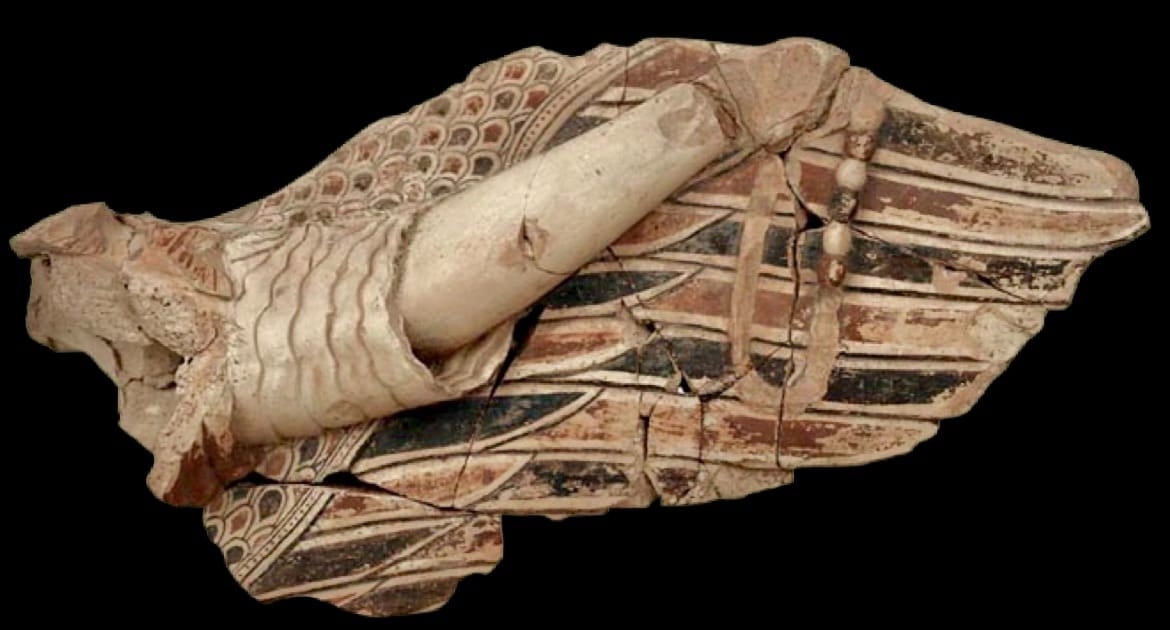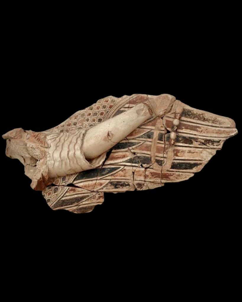 In keeping with the logical tradition of having flying divinities and creatures alighting on the roofs of sacred buildings, the wing belongs to an acroterion of the 6th century B.C. Athena Pronaia. She is Nike, harbinger of victory, or perhaps Iris, colorful messenger of the Olympians and is approximately life-sized. Even intended for such lofty heights the details are extraordinary with a creamy slip on the tender skin of her arm enveloped in her chiton’s delightfully crinkly sleeve and set off against wildly colorful scales and flight feathers.