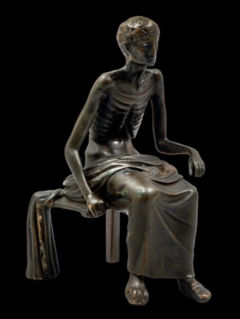 Since the statuette’s discovery in the mid-19th century (in Northern France of all places), his identity and possible medical condition has been the subject of considerable interest. The former partly because of the dotted inscriptions on his garment (Eudamidas and Perdik) – both Greek names, and both with tenuous links to possible mythical or historical figures. His wasted body and peculiar foot have suggested more recently that he suffered from chronic lead poisoning.