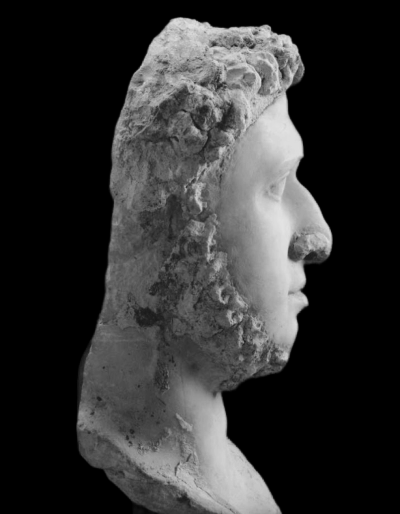 The hair and remarkably the beard – migrating down his temples to the underside of the chin – is fashioned in plaster along with a little alteration to the tip of the nose. In this case, the plaster seems to have been added in a secondary life of the portrait…a cheap(ish) way to ‘update’ it. Remarkable, eh?