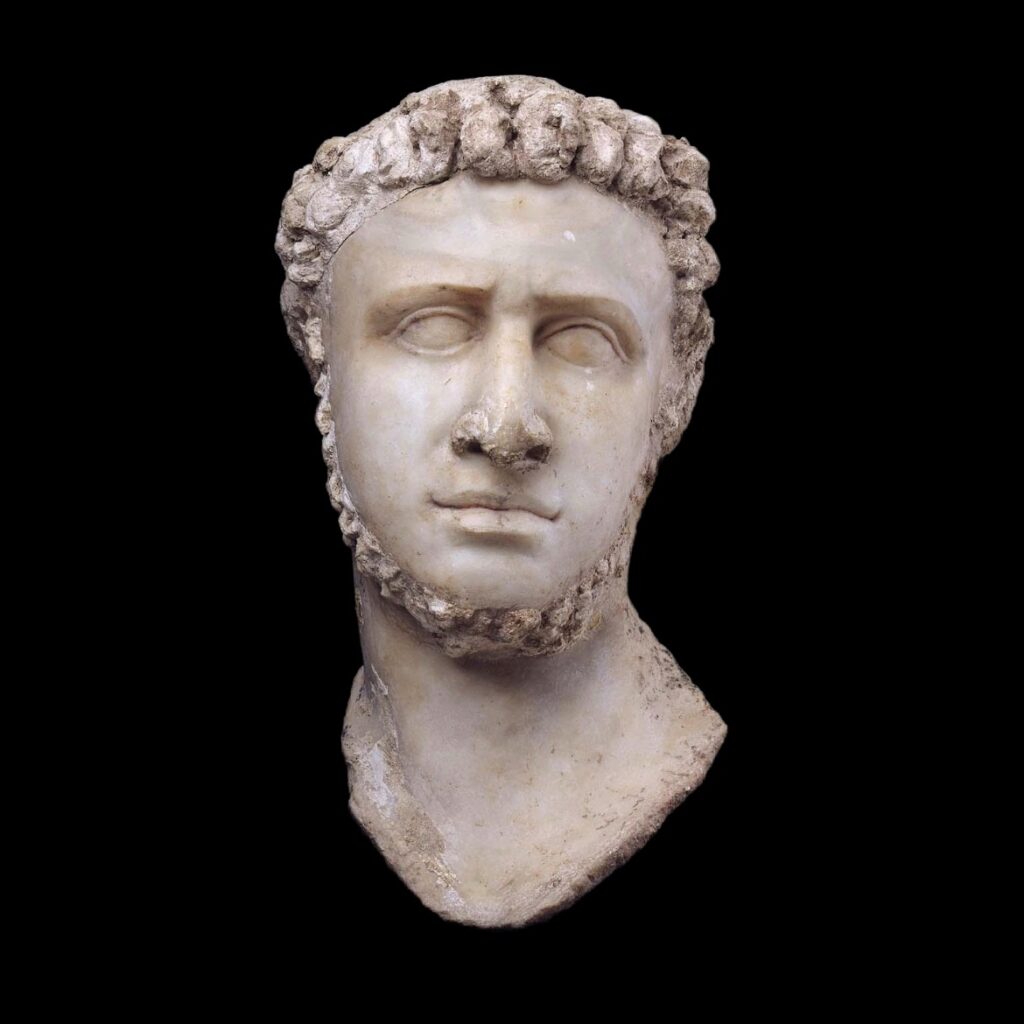 This is quite a face, colossal in scale (clocking in at 64 cm) and unusual in many aspects. Based on comparison with coin portraits, it likely depicts Ptolemy IX (reigning late 2nd – 1st century B.C.).