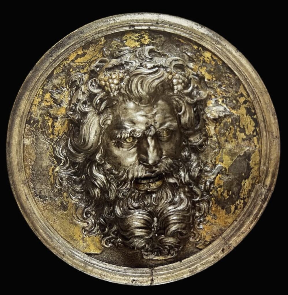 Yet another outrageous thing to find at the bottom of your wine cup! And not the worse place for an aging silenos at the end of his career… It’s a gorgeous but small medallion (silver, chased and gilt) that would have sat in the bottom of a drinking cup and rather small at 8.5 cm in diameter.