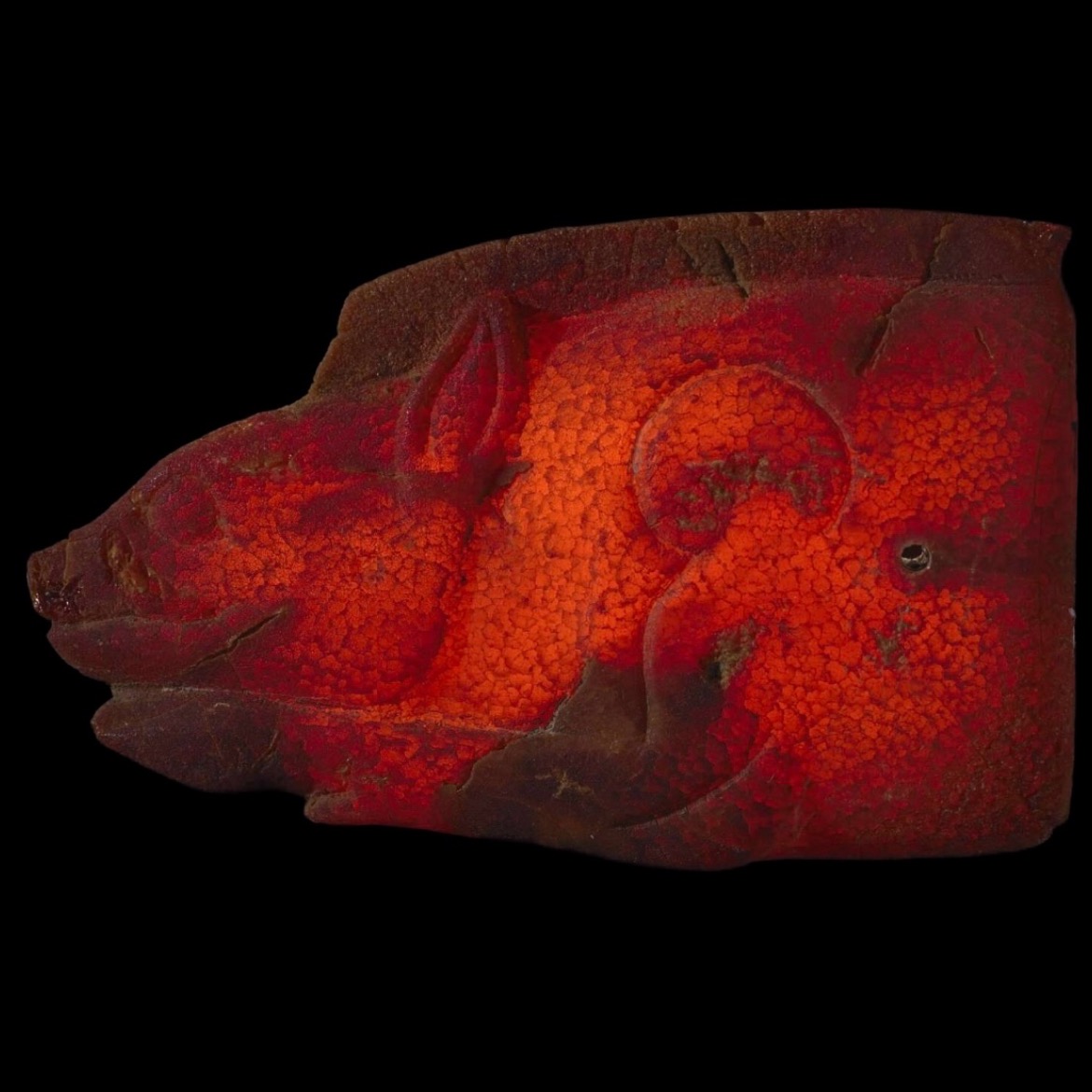 Vanquishing the dread Calydonian boar was the comely young hero’s most famous exploit. This fearsome boar in miniature probably does not refer specifically to the myth of Meleager, but it’s a fun idea to contemplate as boar protomes do seem to have been popular in amber. But what brave hunter with heroic aspirations and a penchant for grandiosity wouldn’t want to wear this luminous hunk upon his chest?