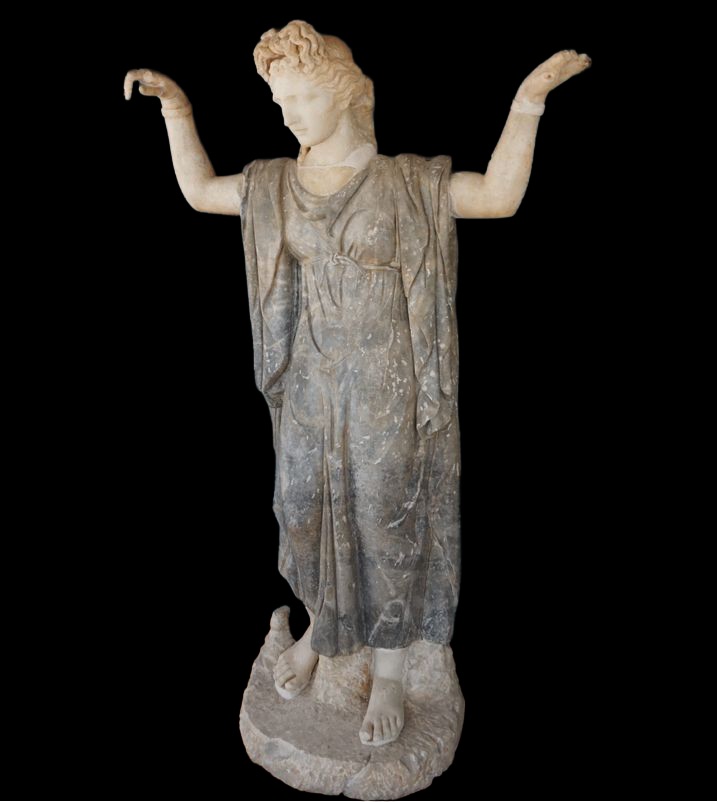 The striking dark grey of her garment and creamy white flesh brings to mind the famed two-tone stone from the Göktepe quarries near Aphrodisias. Would love to hear more learned (I’m out of date!) thoughts on the stone type and possible Aphrodisian origins of marble or sculptors.