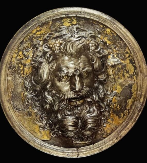 Yet another outrageous thing to find at the bottom of your wine cup! And not the worse place for an aging silenos at the end of his career… It’s a gorgeous but small medallion (silver, chased and gilt) that would have sat in the bottom of a drinking cup and rather small at 8.5 cm
