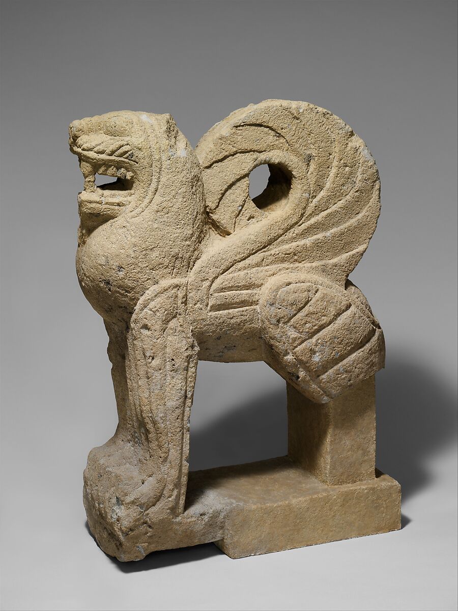 Several statues of this type, made from nenfro, a kind of volcanic stone used extensively at Vulci, depict winged lions and sphinxes. These were set up to protect the entrances to subterranean chamber tombs covered by a tumulus (earthen mound). They often appear in pairs and represent the Etruscan response to a long tradition of guardian figures stretching back to ancient Egypt and the Near East.