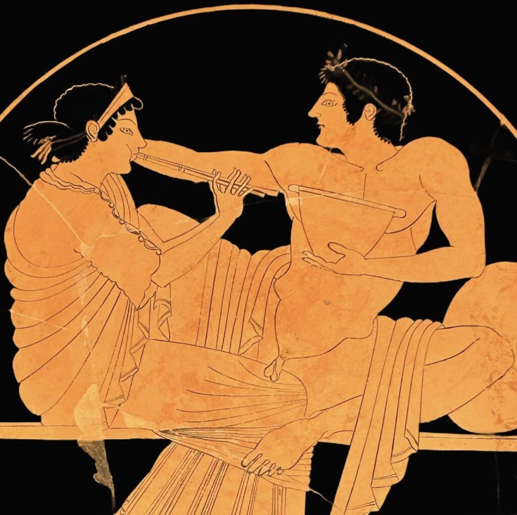 But in passing glance, the subject is not terribly exciting: flute girl in fancy dress serenading an increasingly tipsy and deshabille louche youth at the symposium.