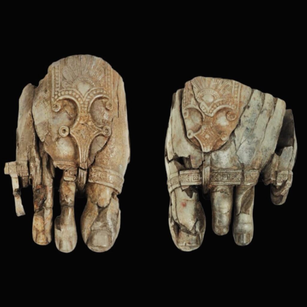 The jumble of ivory body parts found buried together include 6th century B.C. heads originally with inlaid eyes and eyebrows, his twin Artemis and mother Leto all with beatific smiles. To whom these fore-feet belonged is a matter of some debate – potentially one of the women as a more manly specimen was also found in the mix.