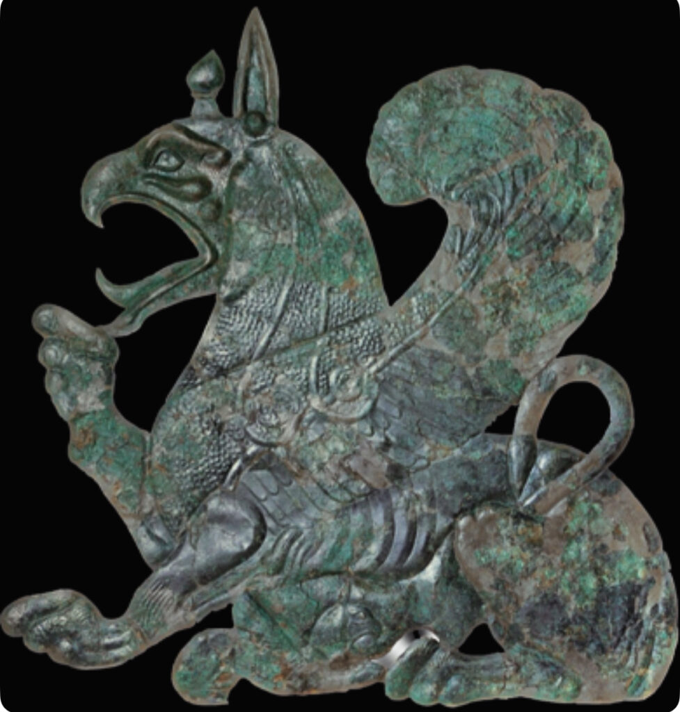 And this is a most remarkable 7th century example from Olympia – the very best century for griffins and where so many excellent examples ended up. It is hammered from bronze sheet with lavish details in repoussé and unusually large, so large that generally it is thought to have been nailed to a wooden structure (perhaps even the metope of a treasury) as a flashy and useful protection against water damage.