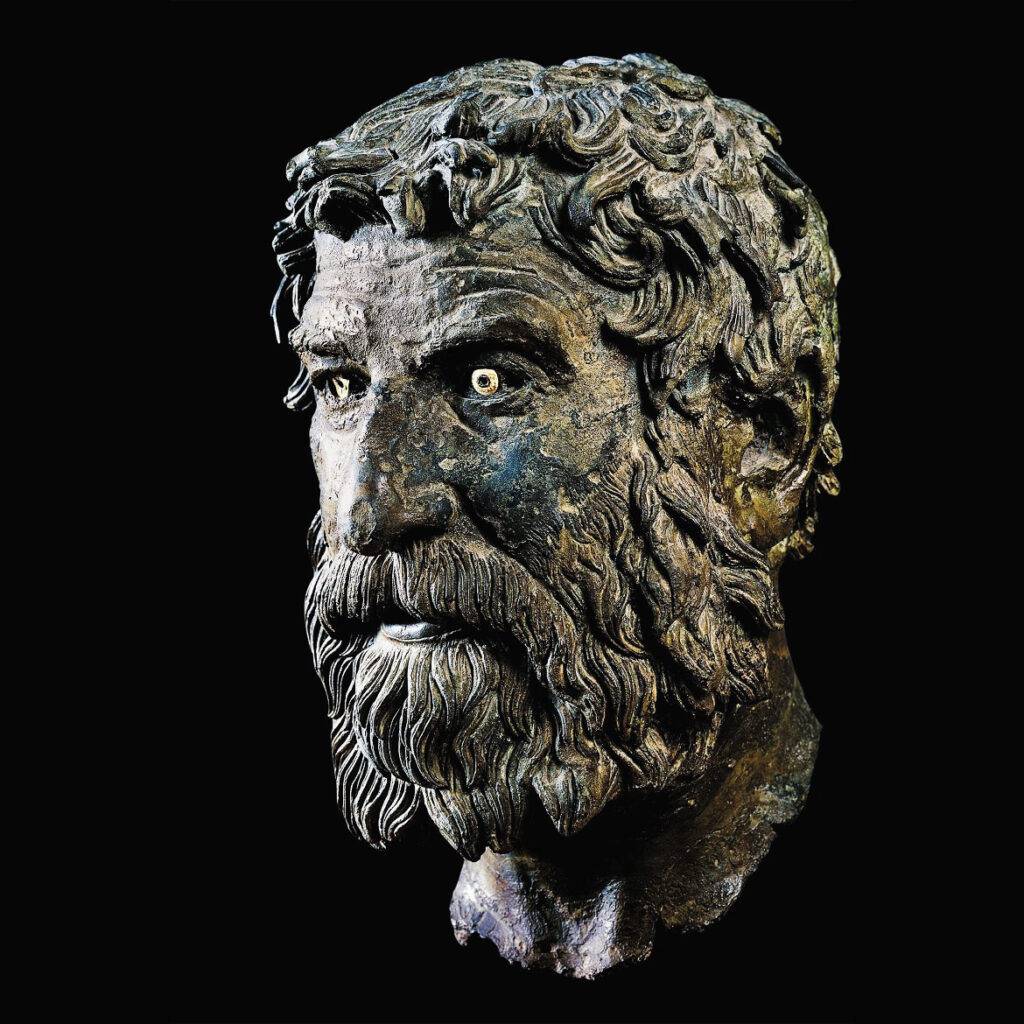 Pulled some 120 years ago from the treacherous maritime straits near the island of Antikythera, this shaggy fellow is one of the finest Hellenistic bronzes to survive. With that engulfing moustache and beard, tousled coiffure, and penetrating gaze (hard to resist a good pair of inlaid eyes), it’s an extraordinarily powerful sculpture.