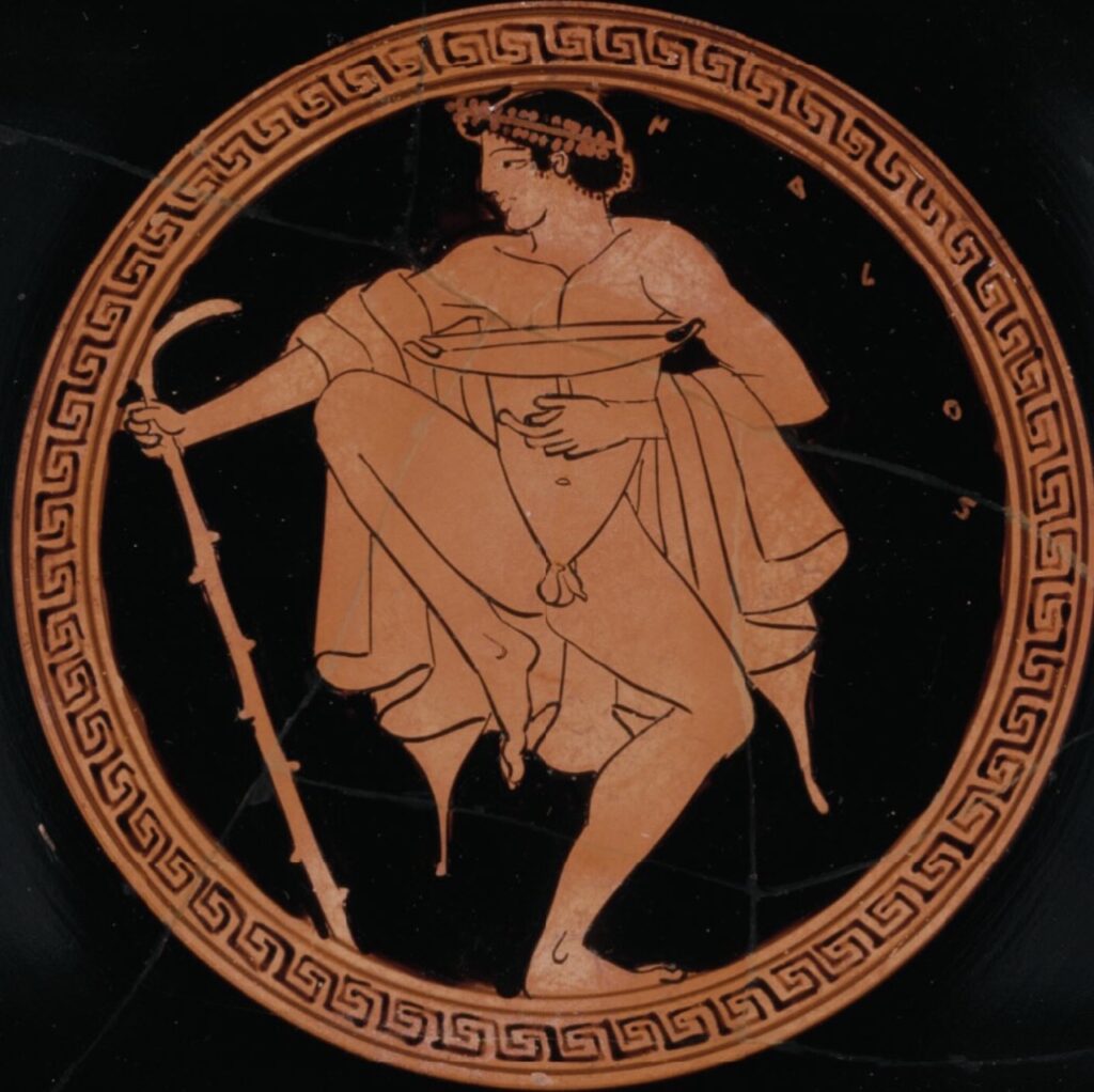 Jaunty wreath perched on his head, walking stick brandished one hand, and drinking cup clutched precariously in the other (a kylix on a kylix! How meta…) he’s likely leaving the symposium and about to progress joyously in the streets outside with his companions.