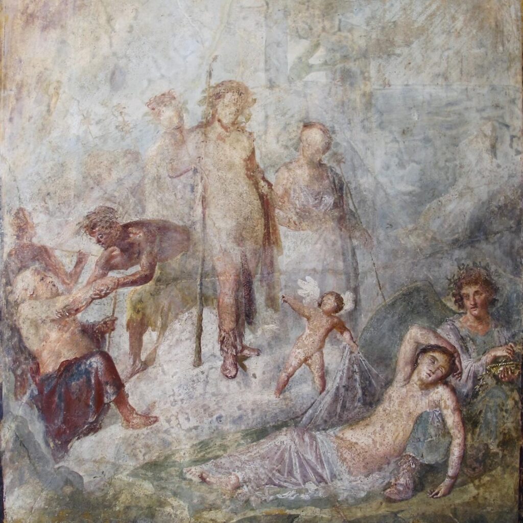 And a particularly popular myth to show in Roman domestic funerary (I especially love a monumental sarcophagus in Antalya showing sleeping Ariadne) and domestic contexts (fantastic examples abound from the Bay of Naples). Ariadne is beautiful in her utter repose, one arm invariably flung over her head, beautiful face exposed for our delectation and that of Dionysos (shown in the second fresco, arriving with his merry entourage) who would soon happen upon her and make a far better mate than Theseus ever did.