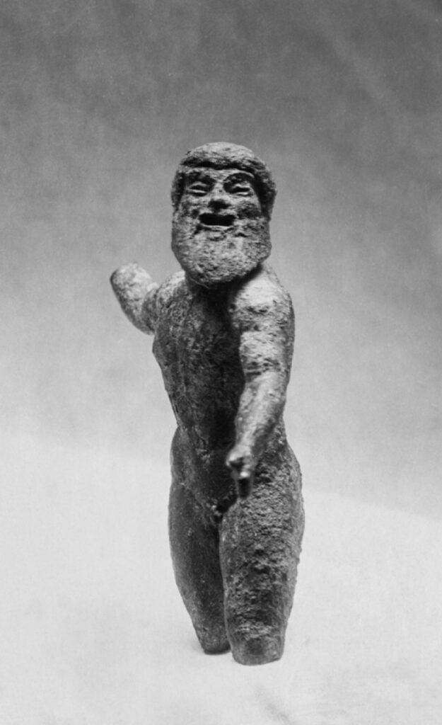 Well this little fellow in the Met (reputedly originally from Cyrene, but I suppose we’d have to posthumously interrogate John Marshall to know that story) is likely one of those two gods, posed in a similar fashion just in miniature and created a generation earlier (ca. 500 B.C.). And with the same lack of of helpful props. Perplexity! Consternation!